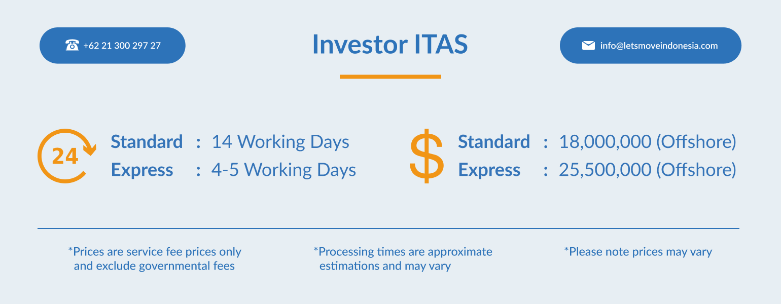 There are 2 options for the Investor KITAS, 1 year and a 2 year KITAS. In Jakarta our prices are 15 Million IDR for the 1-year KITAS and 18 Million IDR for 2-years. Most people opt for the 2-year option as it provides security and increases overall saving over the term of visa.