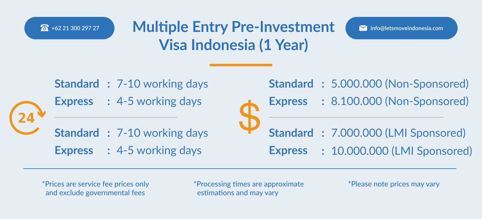 The Multiple Entry Pre-Investment Visa Indonesia has two types of validity periods: 1 year and 2 years. Both types of visas are extendable with 180 days of stay permit per visit within a year for as long as the visa is still valid.