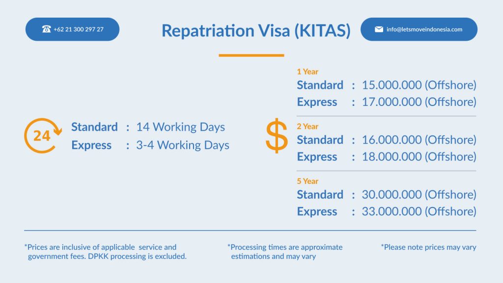 It is a visa for repatriation and 1 year and can be extended annually for a maximum of 6 years. Repatriation KITAS holder can also obtain a KITAP (Repatriation Permanent Stay Permit) which has a validity of 5 years after having a KITAS for just one year. They can choose to extend the KITAS or obtain KITAP after a one-year KITAS.